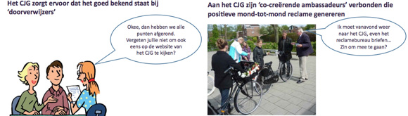 In de tussentijd is het onze rol om op te treden als ‘actieve referenten’ en ‘co-creërend ambassadeurs’ voor het CJG. Door zo vaak mogelijk en langs zo veel mogelijk kanalen ons geloof in een laagdrempelige, openbare voorziening voor opvoeden en opgroeien te uiten. Door onderzoek te doen dat onderbouwing geeft aan dit geloof. Door zo veel mogelijk belanghebbenden – niet in het minst ouders en jeugd zelf – te activeren als co-creators van het CJG, of zelfs als co-eigenaren. Door succesverhalen te delen. Door onze passie over te dragen naar beslissers op centrale posities. Door zelf de rol van beslisser op een centrale positie in te nemen... Langs al deze wegen dragen we bij aan een beweging die zowel verticaal als horizontaal, bottom-up als top-down het CJG voortstuwt naar het omslagpunt waarop de kritische mate van bekendheid, relevantie en aantrekkingskracht bereikt wordt.