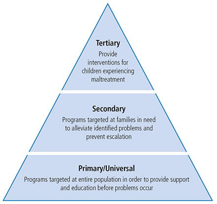 Figure 1: Public health pyramidPublic Health PyramidHet is te wensen dat gemeenten de JGZ in de toekomst in staat blijven stellen te doen, waar de JGZ goed in is – “normaliseren waar het kan”- opdat gebruikmaking van dure tweedelijnszorg zo veel mogelijk wordt vermeden. Het zal een enorme uitdaging zijn voor de JGZ en nog veel meer voor gemeenten om alle mensen (ouders en kinderen) te leren dat hulp vragen en steun zoeken normaal en letterlijk schaamteloos verantwoordelijk gedrag is. Dat leren luisteren naar elkaar (van ouders naar kinderen, van opvoeders naar jongeren, van professionals naar ouders en vice versa) een hoogwaardige menselijke kwaliteit is, die er heel erg toe doet. Dat helpt het normaliseren een stuk verder op de weg, die preventie voorop stelt en onnodige problematiek helpt voorkomen. In Australië heeft Cathryn Hunter (2014; gebaseerd op Bromfield & Holzer, 2008) dat onlangs nog weer eens mooi in een piramide gegoten om duidelijk te maken waar het eerste aangrijpingspunt ligt voor zo’n zorg voor jeugd.